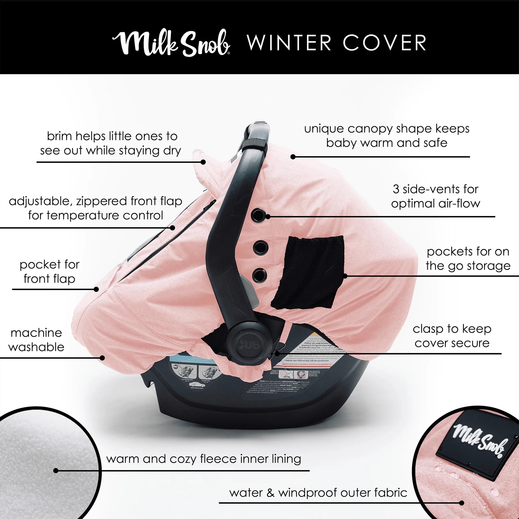 Milk Snob Winter Car Seat Cover is a safe cover designed specifically for cold weather. The unique canopy shape keeps baby warm and cozy while providing proper air circulation, and the brim helps little ones to see out while staying dry! Easily adjust air flow by pulling the car seat canopy forward. Not for use inside a vehicle. This product features a soft pink outer fabric.